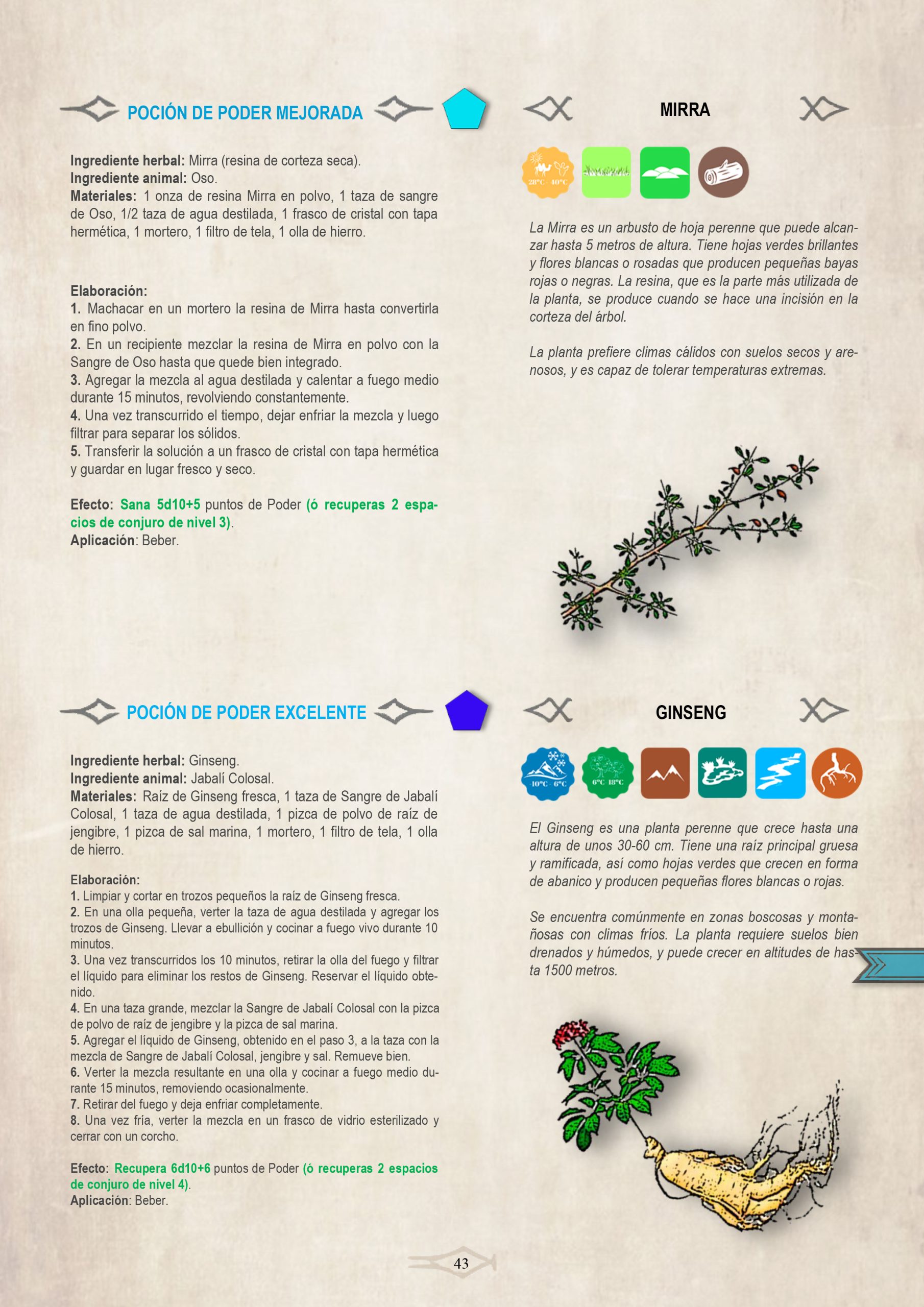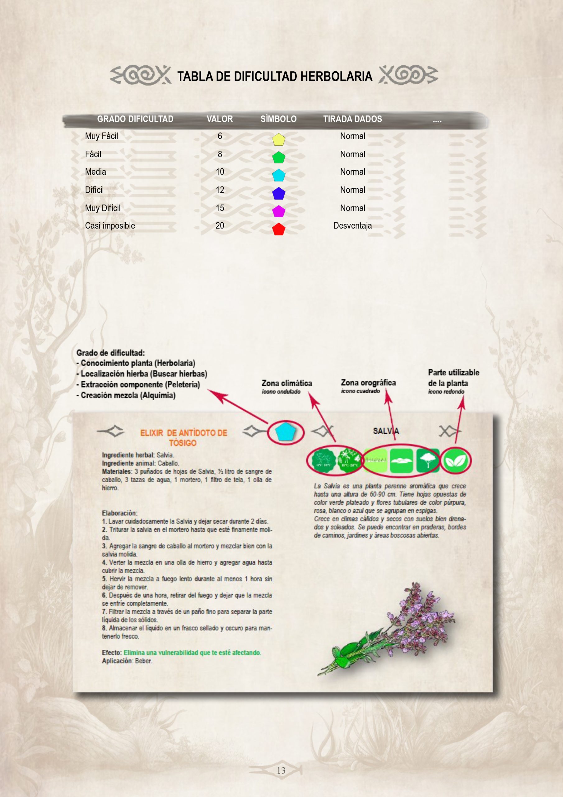 - Más de 80 especies vegetales diferentes, especificando; zona climática y orográfica dónde recolectarlas, parte de la planta a utilizar para las mezclas alquímicas y grado de dificultad de localizarlas.
