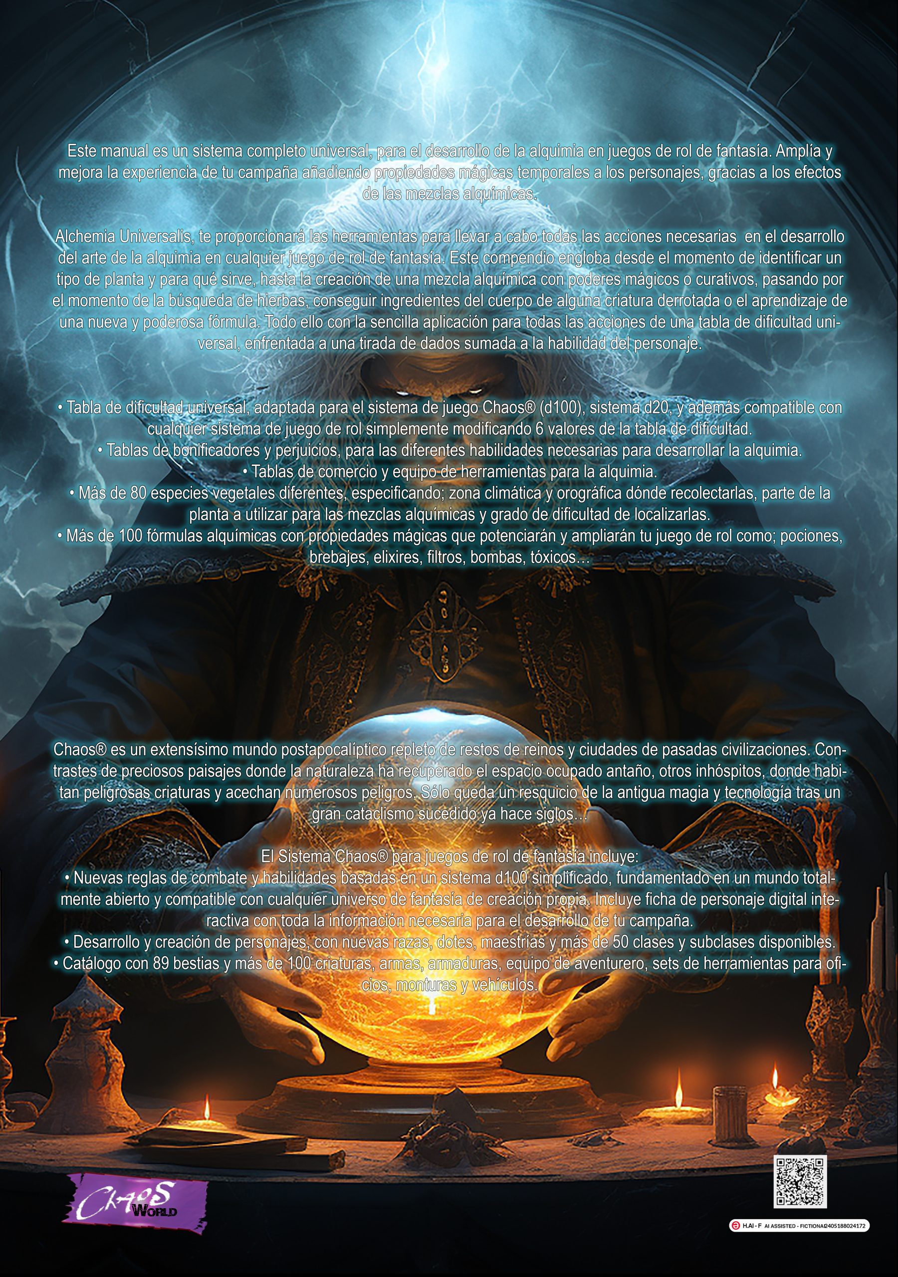 Alchemia Universalis, te proporcionará las herramientas para llevar a cabo todas las acciones necesarias en el desarrollo del arte de la alquimia en cualquier juego de rol de fantasía. Este compendio engloba desde el momento de identificar un tipo de planta y para qué sirve, hasta la creación de una mezcla alquímica con poderes mágicos o curativos, pasando por el momento de la búsqueda de hierbas, conseguir ingredientes del cuerpo de alguna criatura derrotada o el aprendizaje de una nueva y poderosa fórmula. Todo ello con la sencilla aplicación para todas las acciones de una tabla de dificultad universal, enfrentada a una tirada de dados sumada a la habilidad del personaje.